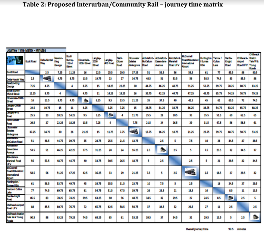 Rail for the Valley’s, Leewood Study sees a 90 minute trip time from Chilliwack to Scott Road Station, about 30 minutes slower than taking the car, in perfect conditions.