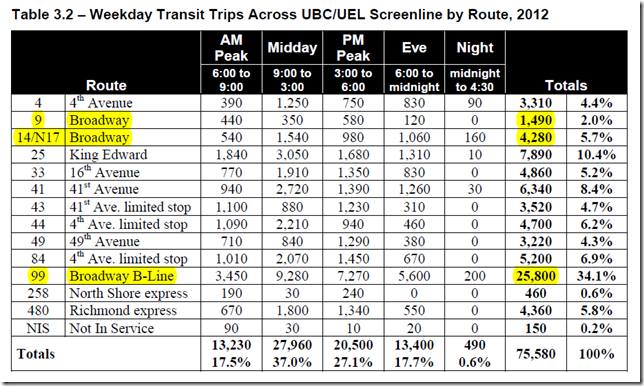 Note as well that we’re also ignoring the city’s “densification” plans for Broadway, Arbutus and elsewhere. The city is allowing new buildings to be built with far fewer parking stalls per unit these days. At present these people are still mostly drivers (they simply end up parking on the streets instead). Some percentage of these people should also be included as potential riders.