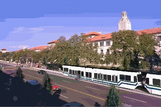 Basically, the city’s neediest travel corridor runs along a couple of major central-city thoroughfares called Lamar and Guadalupe, which channel a huge travel flow from the north and northwest down southward through the heart of the city and into the Core Areaai??i??including the University of Texas (plus the fourth-densest residential neighborhood in the state), the Capitol Complex (state Capitol plus a cluster of state offices), and Austin’s downtown. (A depiction of the proposed service, envisioned as LRT, is at left.)