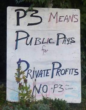 In Canada, P’s are a sort of money laundering scheme, designed to spread and hide the real cost of a transit project over time,Ai??from the taxpayer. P-3’sAi??are also used as aAi??tool to protect corporate revenue streams, to the detriment of the local taxpayer. In Canada, for little investment the return on a P-3 can be many times higher than other investments and to top it all off, in Canada, those investing in a p-3 assumes little or no risk!