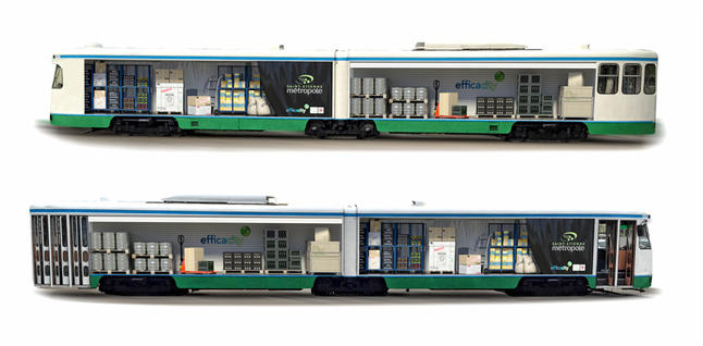 The success of Dresden’s freight tram was based on moving car components, via container, from one factory to another across the city. In St. Etienne, it’s the concept of moving smaller loads from one central distribution point outside the city centre to smaller ones inside the city, taking delivery trucks off congested roads.