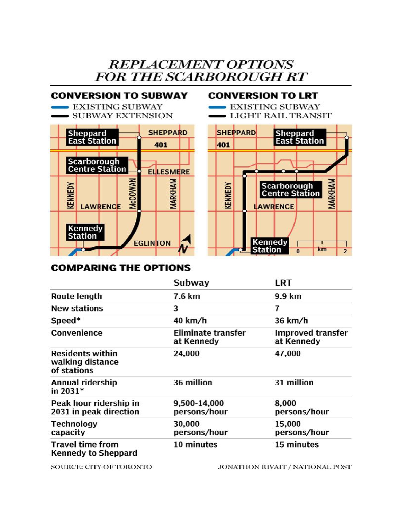 (Source: Scarborough LRT Environmental Assessment, 2010; Scarborough-Malvern LRT EA, 2009; Scarborough Subway Extension updated business case, 2017)