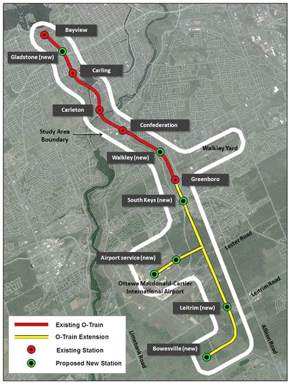 On May 3, 2020, the line was shut down for a three-year upgrade and expansion project, which will add eight stations and 16 kilometres (10 mi) of track, including a spur to Macdonald–Cartier International Airport. During its closure, service along the line is being provided by buses. The upgraded and expanded line is expected to reopen in 2023.