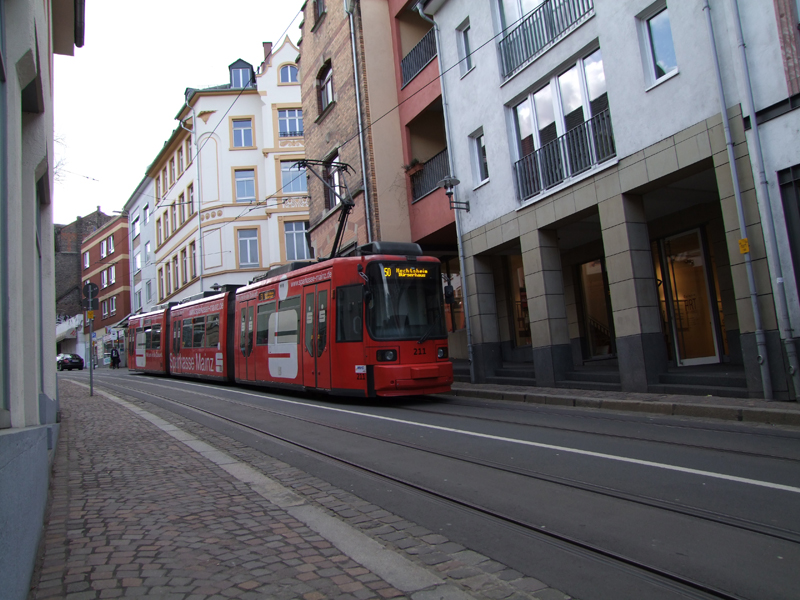 A tram descending a 9.5% grade in Mainz, Germany.