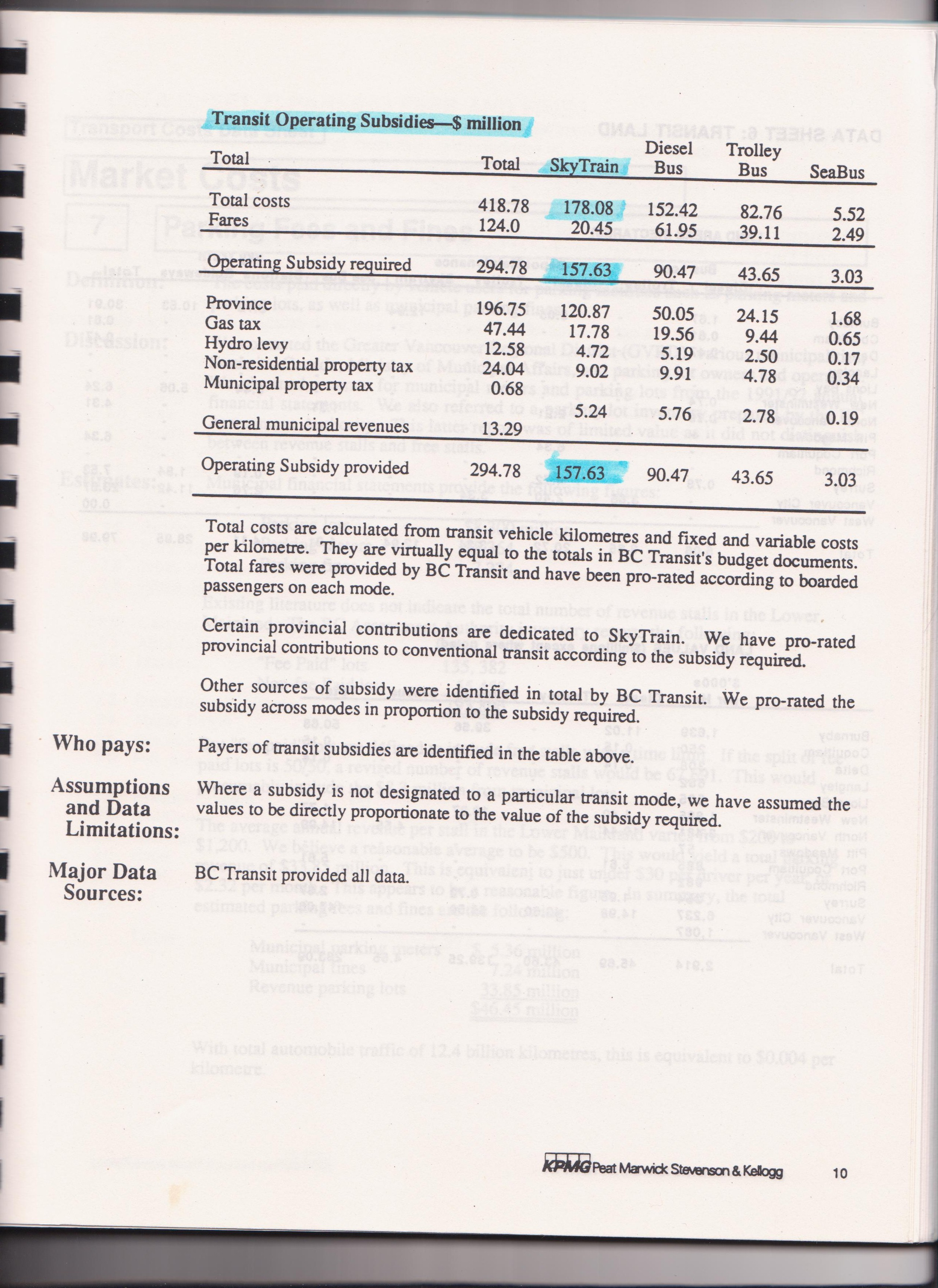 The table clearly shows the $157 million operating subsidy for that year and now twenty-one years later, TransLink and Metro Vancouver are loath to enter an updated table showing the the annual subsidy for the SkyTrain and Canada line systems. Before next years referendum, the public should demand a concise table as like the one above, showing the transit operating subsides for transit in 2014.